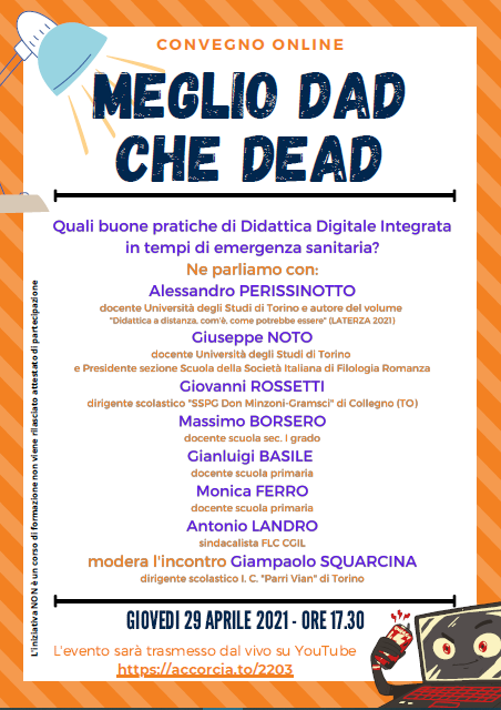 L’iniziativa “Meglio DAD che Dead” è moderata dal DIrigente Scolastico dell’Istituto Comprensivo Parri Vian e vi sarà anche l’intervento del docente universitario Alessandro Perissinotto, autore del libro “Didattica a distanza com’è, come potrebbe essere” della Casa Editrice Laterza, 2021.